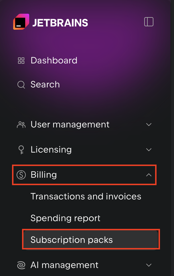 JetBrains Console にはチームとは別に購入の単位を管理するサブスクリプションパックが存在します。オーガニゼーション管理者が JetBrains Console の Billing の Subscription Packs メニューで確認できます。