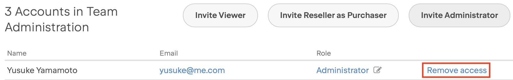 - 他のチーム管理者を取り消す場合は該当のユーザー名の右側にある Remove access をクリックします。