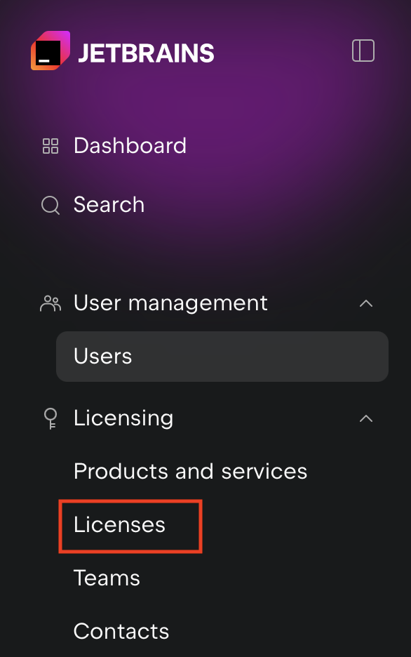 - JetBrain Console の左側のメニュー一覧より Licensing の Licenses メニューを選択します
