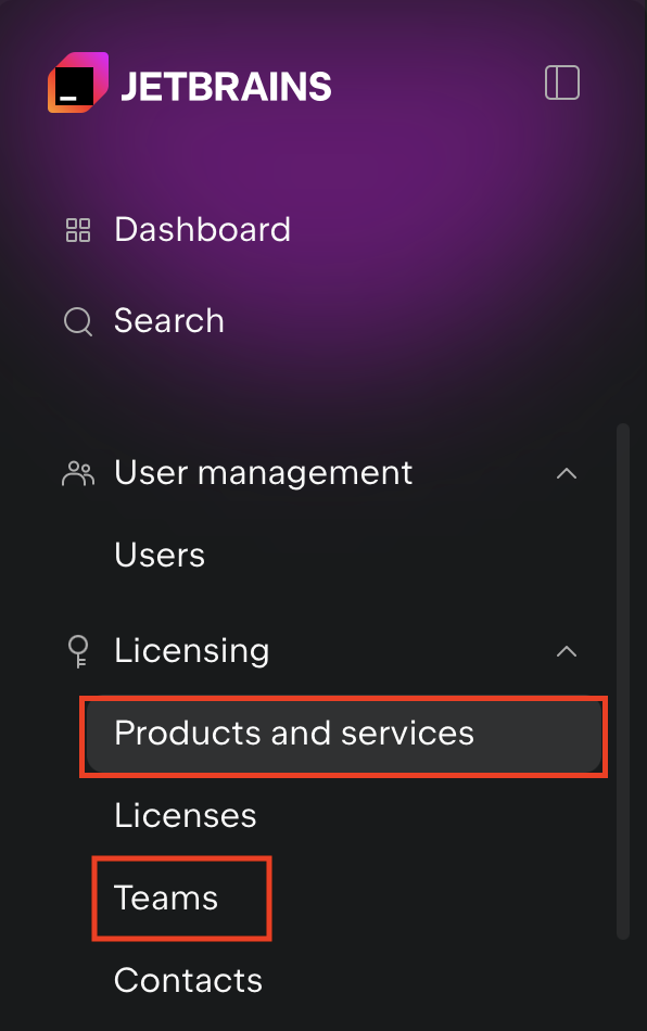 オーガニゼーション管理者がオーガニゼーション全体からライセンスを検索したい場合は JetBrain Console の左側のメニュー一覧より Licensing の Products and services メニューを選択します。