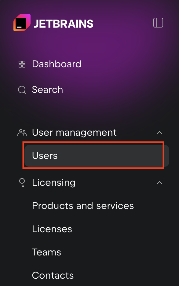 - JetBrain Console の左側のメニュー一覧より User management の Users メニューを選択します