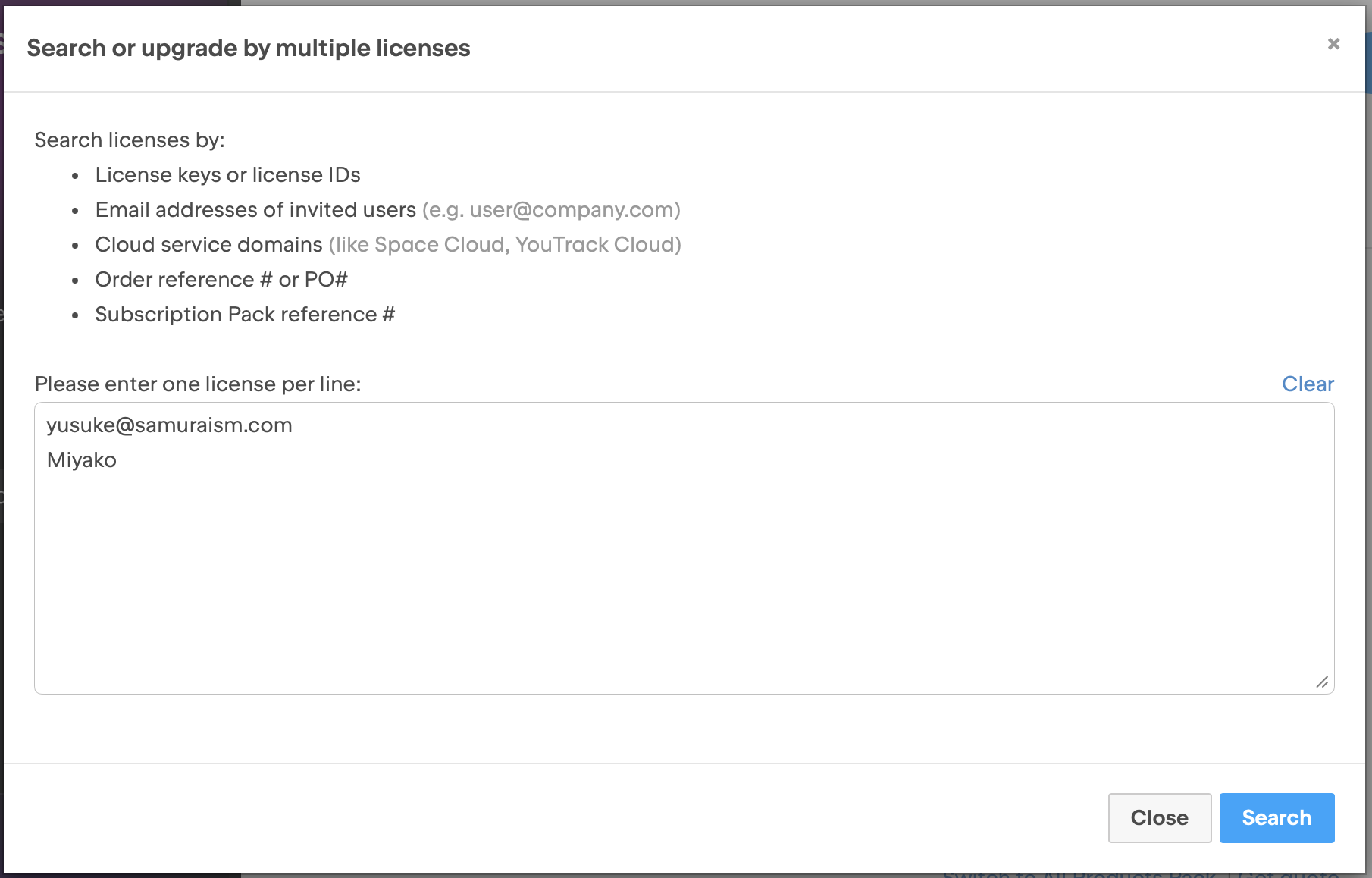 - Please enter one license per line: 欄にユーザーのメールアドレスやその一部、ライセンスIDなどを入力して Search ボタンを押下してください